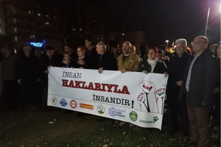 Bursa’da 10 Aralık İnsan Hakları Günü kapmasında Bursa Tabip Odası, KESK, DİSK, TMMOB, Bursa Kent Konseyi, Osmangazi Kent Konseyi, Nilüfer Kent Konseyi ve Doğader’in çağrısıyla Üç Fidan Parkı’nda basın açıklaması gerçekleştirildi.