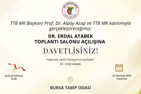 22 Temmuz 2024 Pazartesi günü saat 18.00’da BAOB Bursa Tabip Odası 2. katta, TTB Merkez Konseyi Başkanı Prof. Dr. Alpay Azap ve TTB Merkez Konseyi katılımıyla gerçekleştireceği ‘Dr. Erdal Atabek Toplantı Salonu’ açılışına davetlisiniz!