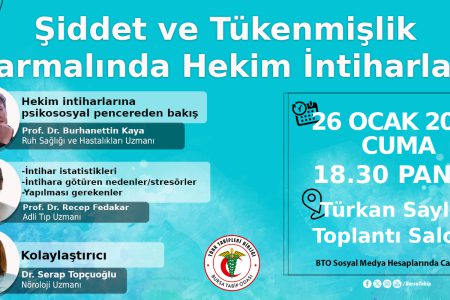 Bursa Tabip Odası tarafından düzenlenen ‘Şiddet ve Tükenmişlik Sarmalında Hekim İntiharları Paneli’ paneli, 26 Ocak 2024 Cuma günü saat 18.30’da Bursa Akademik Odalar Birliği Türkan Saylan Toplantı Salonu’nda gerçekleşecektir.