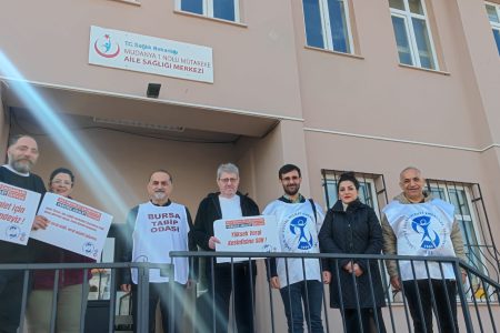 Bursa Tabip Odası ve SES Bursa Şubesi, Mudanya 1 No’lu Mütareke Aile Sağlık Merkezi ve Mudanya Şükrü Çavuş 2 No’lu Aile Sağlığı Merkezlerinin önünde vergide adalet talebiyle eylem yaptı.