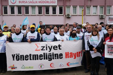 Bursa Tabip Odası (BTO), Genel Sağlık İş Sendikası Bursa Şubesi, HEKİM SEN Bursa Şubesi, Hekimler Birliği Sendikası Bursa Şubesi, Sağlık ve Sosyal Hizmetler Emekçileri Sendikası Bursa Şubesi (SES), Bursa Aile Hekimleri Derneği (BURSAHED) ile Birlik ve Dayanışma Sendikası’nın çağrısıyla Bursa İl Sağlık Müdürlüğü önünde bir araya gelen sağlık çalışanları basın açıklaması gerçekleştirdi.