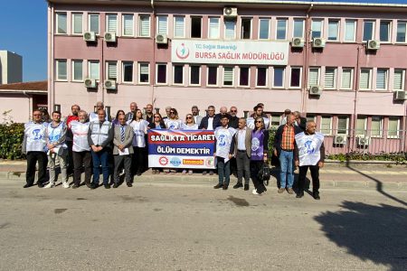 Bursa Tabip Odası, KESK, DİSK, SES ve TMMOB, Bursa İl Sağlık Müdürlüğü önünde yenidoğan bebek ölümleri hakkında basın açıklaması gerçekleştirerek ‘Sağlıkta Ticaret Ölüm Demektir’ dedi.