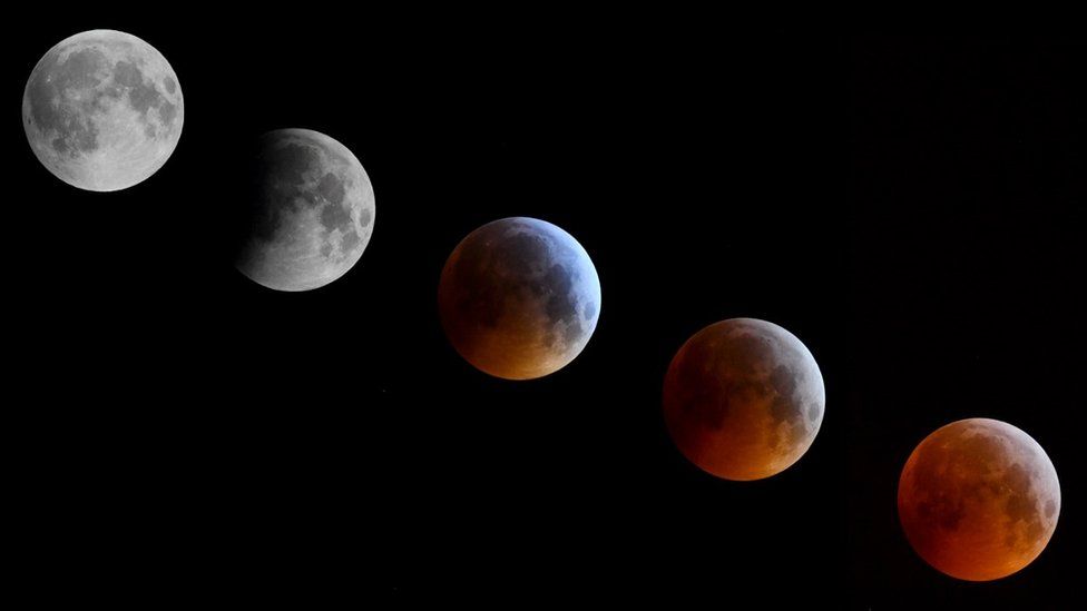 Tam Ay tutulması sırasında atmosferde filtrelenen ışıklar nedeniyle Ay kırmızı bir görünüm alır.
