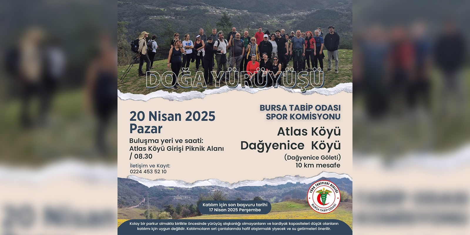Bursa Tabip Odası Spor Komisyonu tarafından düzenlenen doğa yürüyüşümüze tüm üyelerimiz davetlidir! Hep birlikte doğanın keyfini çıkaracağımız bu etkinlikte, Atlas Köyü’nden başlayarak Dağyenice Köyü’ne kadar uzanan yaklaşık 10 km’lik rotada yürüyeceğiz.