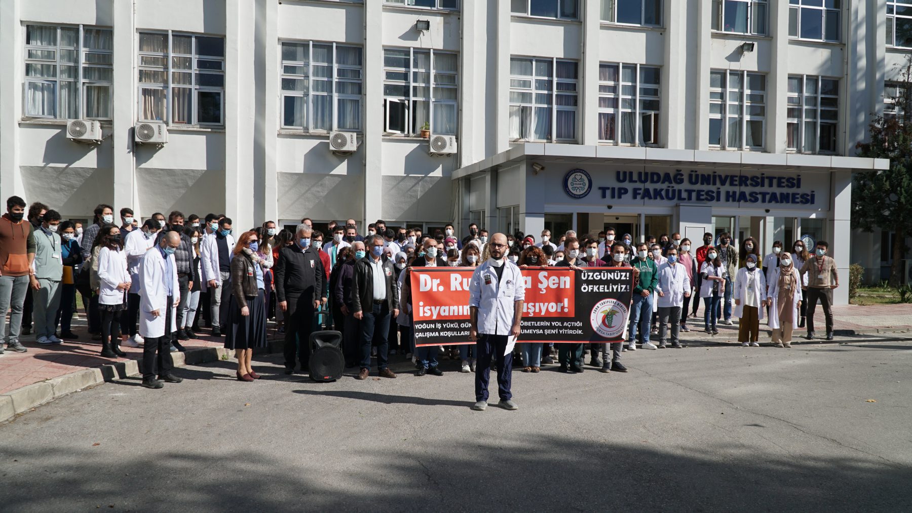 23 Ekim’de, 36 saatlik nöbetinin ardından aracıyla evine gitmek için yola çıkan Dr. Rumeysa Berin Şen, yol kenarında duran kamyona arkadan çarparak hayatını kaybetti. 25 yaşındaki Ankara Şehir Hastanesi Kadın Doğum Kliniği Asistanı Dr. Şen’in vefatı, tüm sevenlerini ve meslektaşlarını yasa boğdu. Genç meslektaşları Dr. Rumeysa Berin Şen’i anmak için Bursa Uludağ Üniversitesi Tıp Fakültesi Hastanesi önünde toplandı. Bursa Tabip Odası Başkanı Halk Sağlığı Uzmanı Doç. Dr. Alpaslan Türkkan’ın da katılım gösterdiği etkinlikte, uzun saatler nöbetlerin, ücret kesintilerinin ve baskıların asistan hekimleri ölüme süreklediği belirtildi.