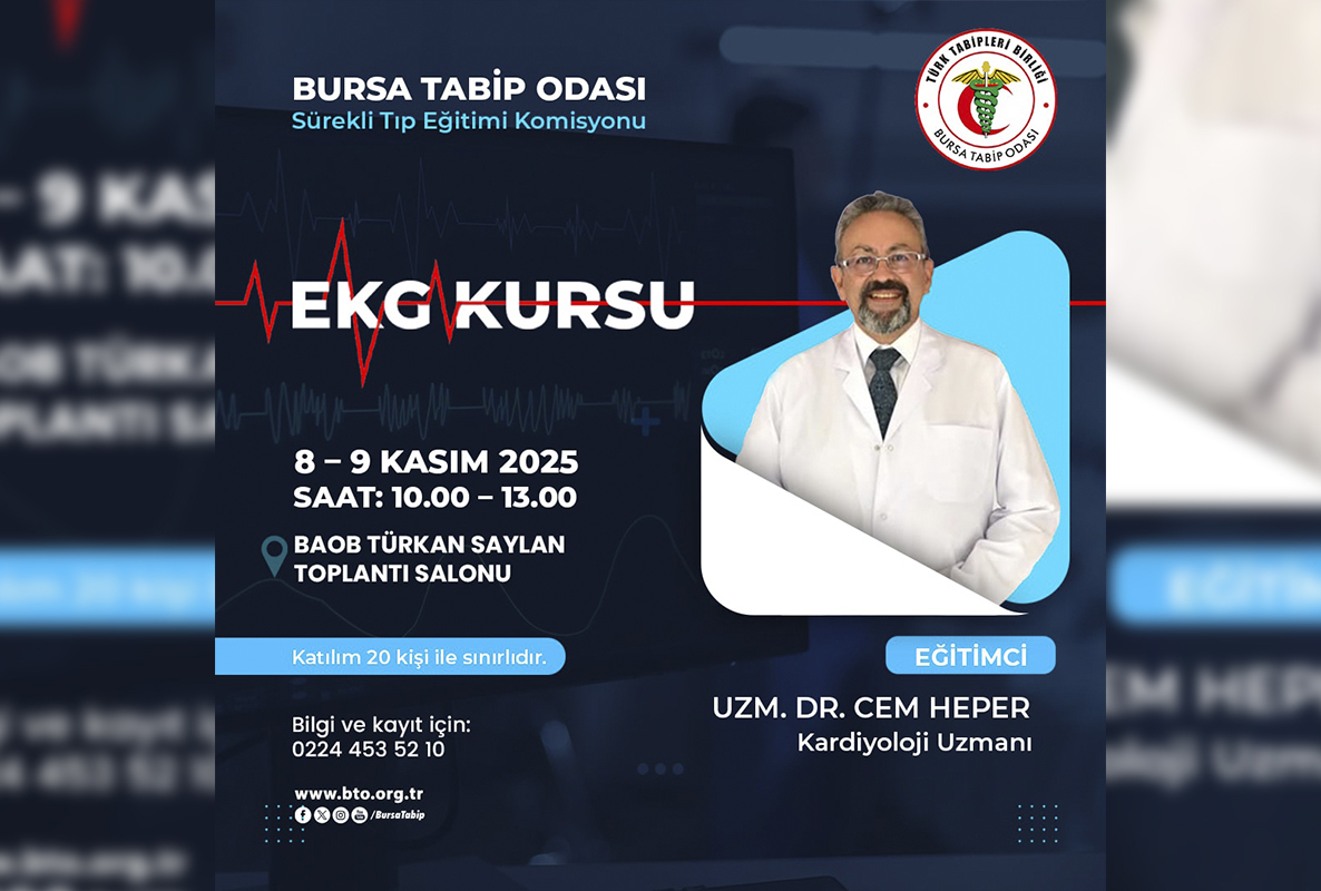 Bursa Tabip Odası Sürekli Tıp Eğitimi Komisyonu tarafından düzenlenen EKG Kursu, 8–9 Kasım 2025 tarihlerinde gerçekleşiyor.