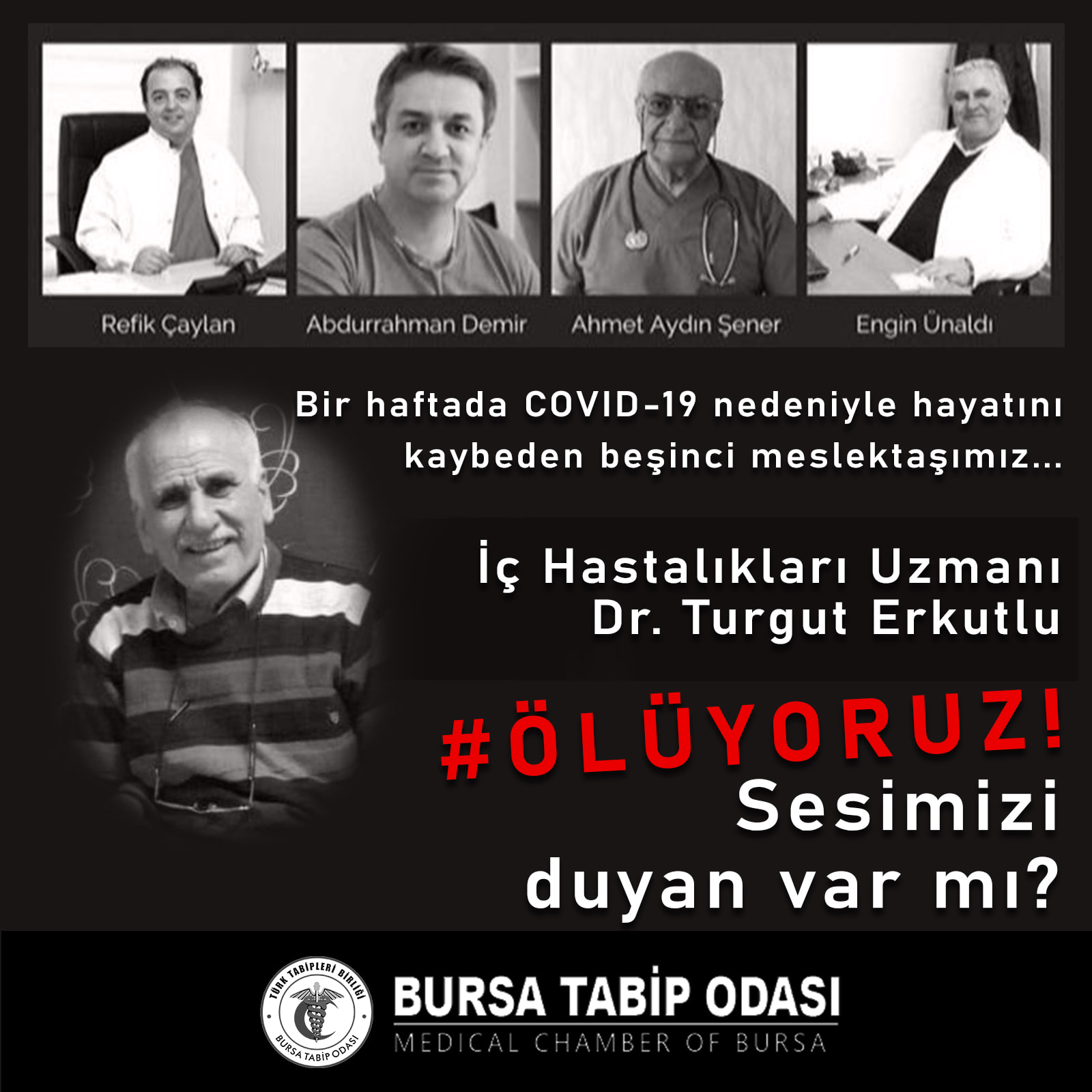 Bir hafta önce 46 yaşındaki doktor Abdurahman Demir, corona virüsü nedeniyle tedavi gördüğü hastanede yaşamını yitirmişti. Daha sonrasında da acı haberler ardı ardına geldi. 25 Ağustos’ta ilk vefat haberi Sinop’tan geldi. Aile hekimliği yapan Dr. Engin Ünaldı, koronavirüsle savaşını kaybetmişti. Aynı günün akşam saatlerinde bir diğer acı haber Ağrı’dan ulaştı. Ağrı’da görev yapan Uzm. Dr. Ahmet Aydın Şener de COVID-19 nedeniyle hayata gözlerini yummuştu. Tıp camiasını sarsan haberler 26 Ağustos’ta da gelmeye devam etti. Prof. Dr. Refik Çaylan, COVID-19 nedeniyle tedavi gördüğü hastanede hayatını kaybetmişti. Aynı günün geç saatlerinde bir ölüm haberi de Mersin’den geldi. Mersin Şehir Hastanesi’nde görev yapan Dr. Turgut Erkutlu da koronavirüse yenik düştü.  Böylece sadece 7 günde 5 hekim meslektaşımız hayatını kaybederken, bu sürede hayata gözlerini yuman topla sağlık çalışanı sayısı 10’u buldu.