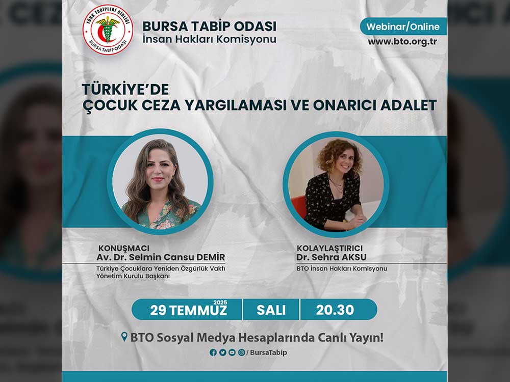 Bursa Tabip Odası İnsan Hakları Komisyonu tarafından 29 Temmuz 2025 Salı akşamı çevrim içi olarak düzenlenen etkinlikte, Türkiye Çocuklara Yeniden Özgürlük Vakfı Yönetim Kurulu Başkanı Av. Dr. Selmin Cansu Demir konuşmacı olarak yer aldı. Kolaylaştırıcılığını BTO İnsan Hakları Komisyonu Başkanı Dr. Sehra Aksu’nun yaptığı etkinlikte, çocuk ceza adalet sistemi, onarıcı adalet ilkeleri ve mevcut yasal çerçevenin çocuk hakları açısından değerlendirilmesi ele alındı.